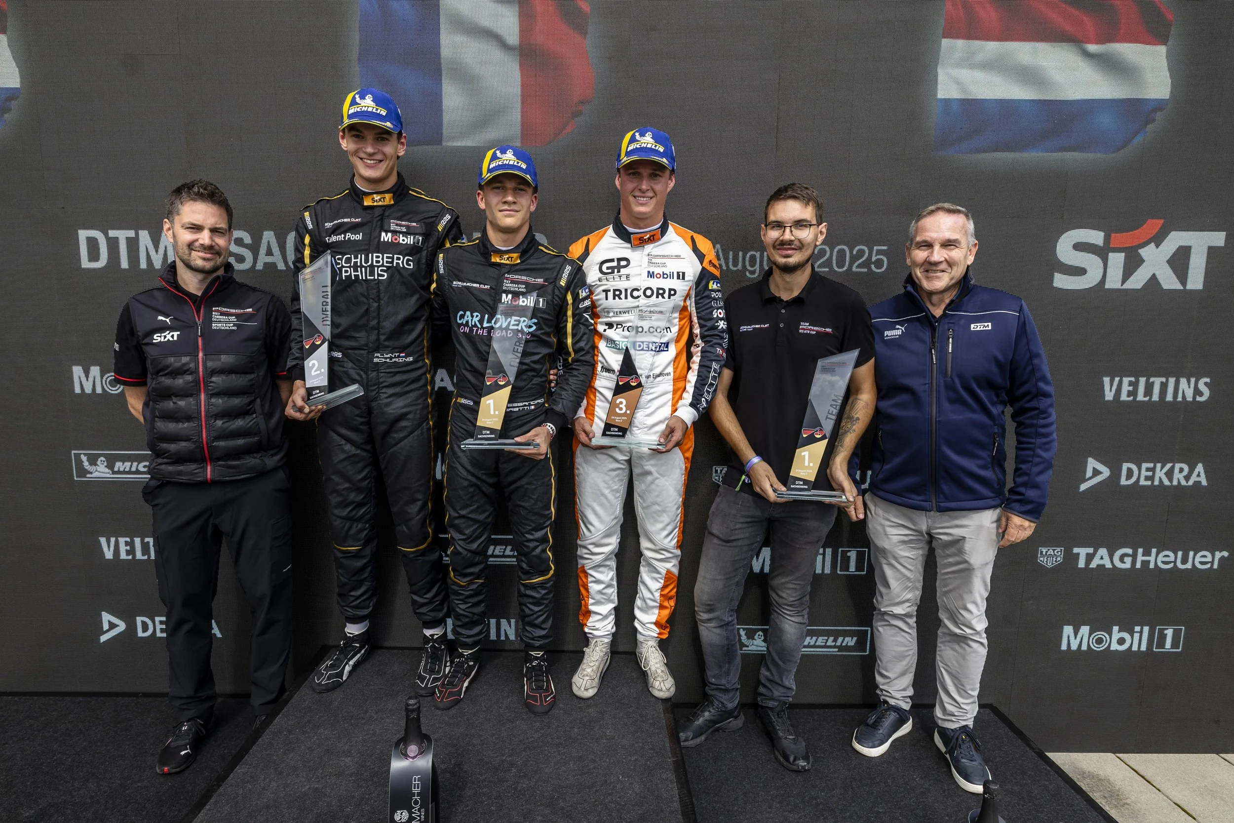 “I really didn’t expect that,” admitted Alessandro Ghiretti. After an unsuccessful overtaking attempt right after the start, the Porsche Junior had to settle for second place. “My plan was to attack Robert in the final two laps, but of course I don’t know if it would have worked,” said the Frenchman. This marked the second one-two victory within 24 hours for the French Schumacher CLRT team. Flynt Schuring, winner of Saturday’s race, finished second this time behind teammate Ghiretti. “I was able to get past Kas Haverkort right off the line. After that, it was a quiet race for me,” said the 19-year-old Dutchman from the Porsche Sixt Carrera Cup Talent Pool.