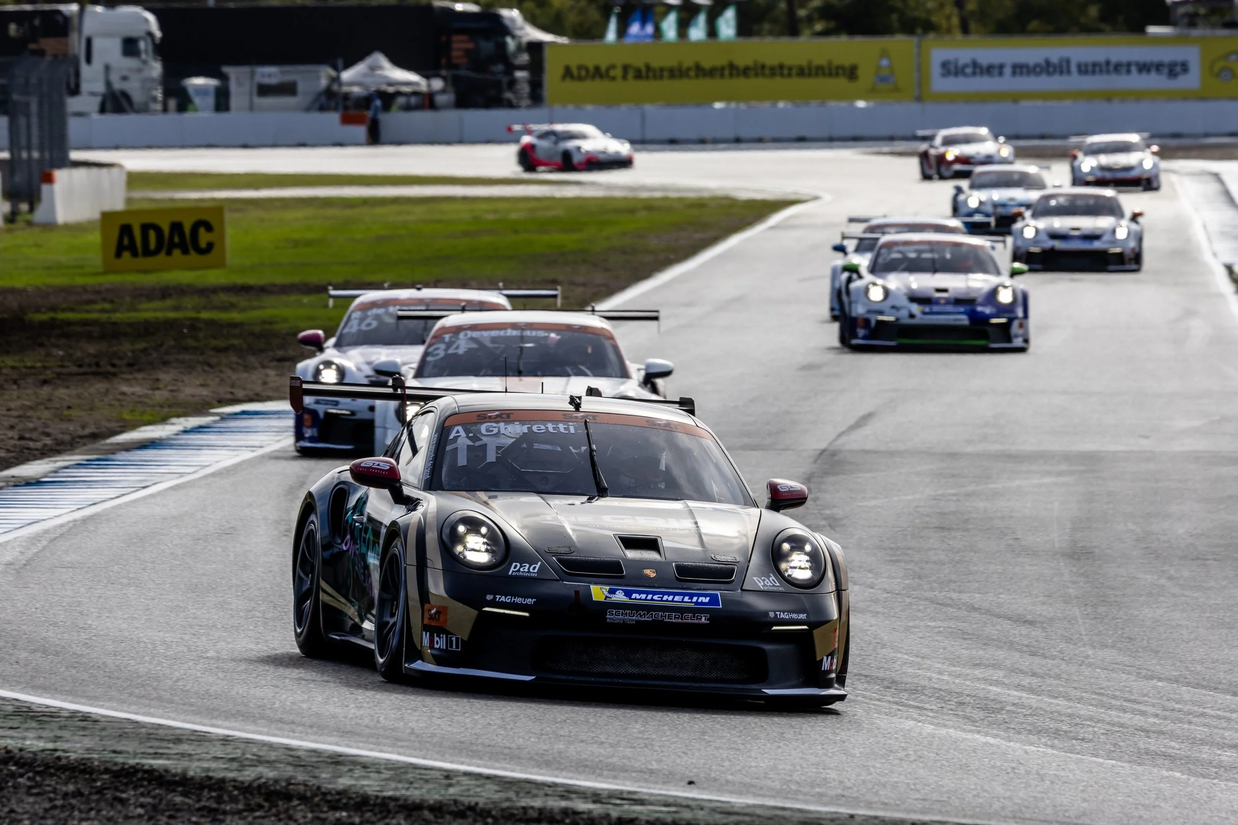 Pole-sitter Flynt Schuring, meanwhile, chose not to push ahead. The 19-year-old Dutchman from the Porsche Sixt Carrera Cup Deutschland Talent Pool quickly pulled almost five seconds clear of the field. The chasing pack initially settled into formation, with Alessandro Ghiretti hanging at a respectful distance behind Robert de Haan in third.