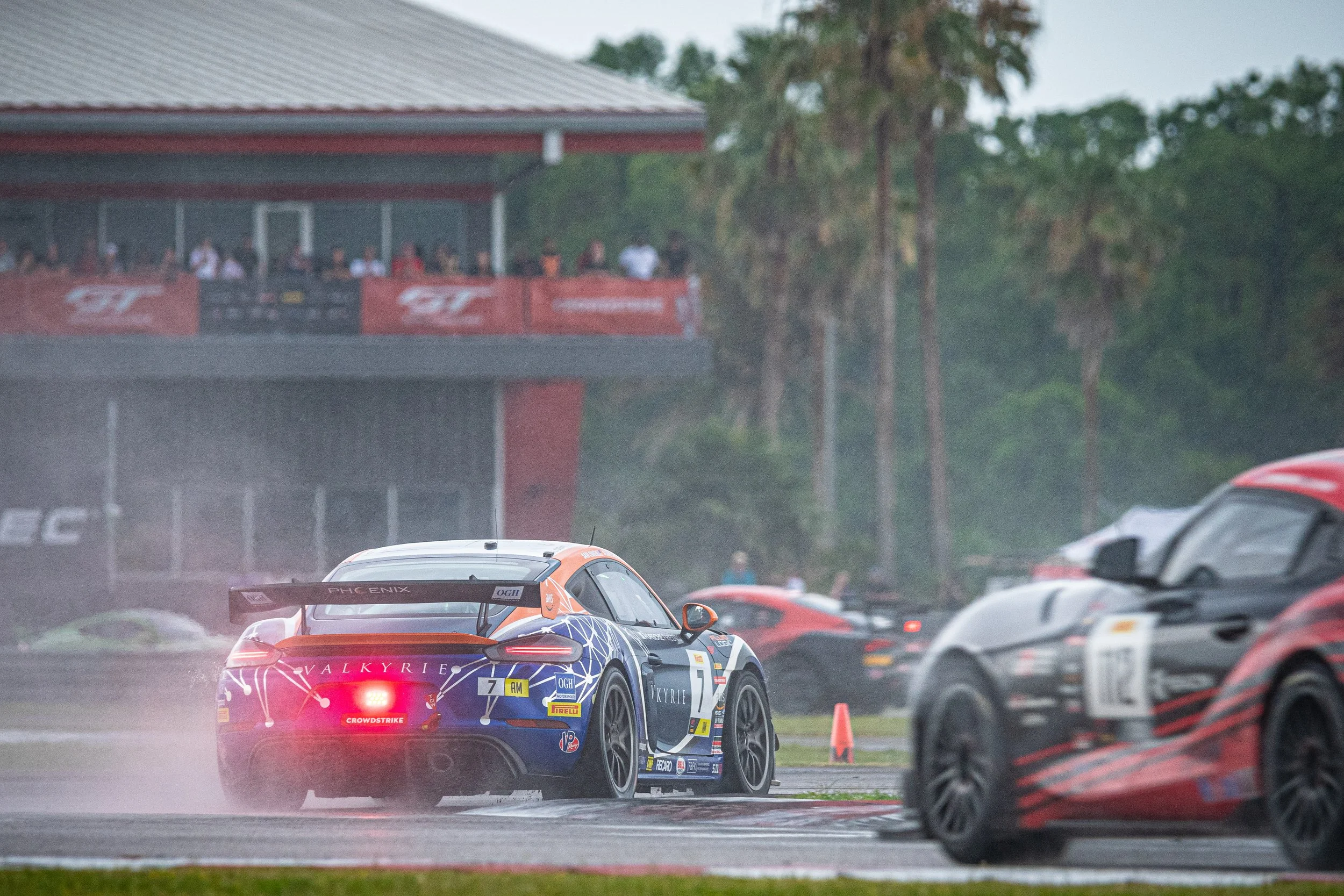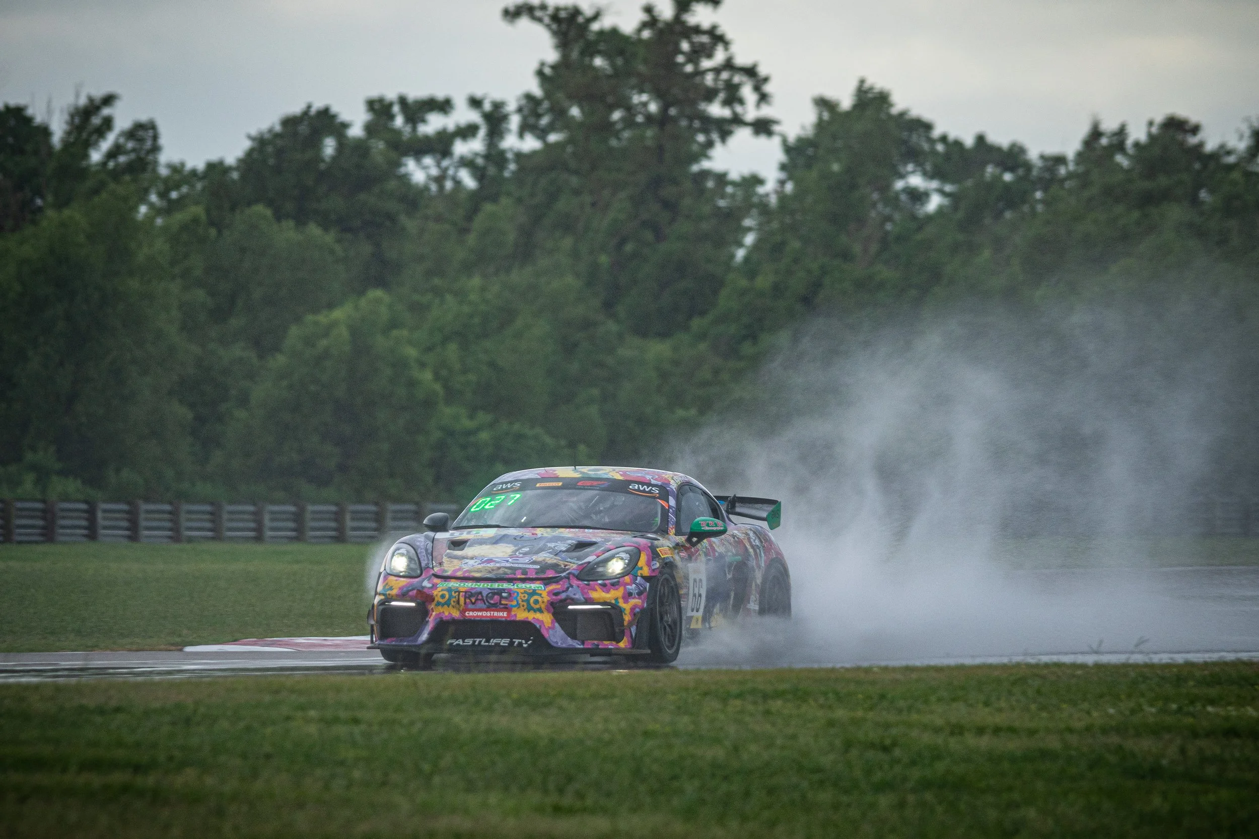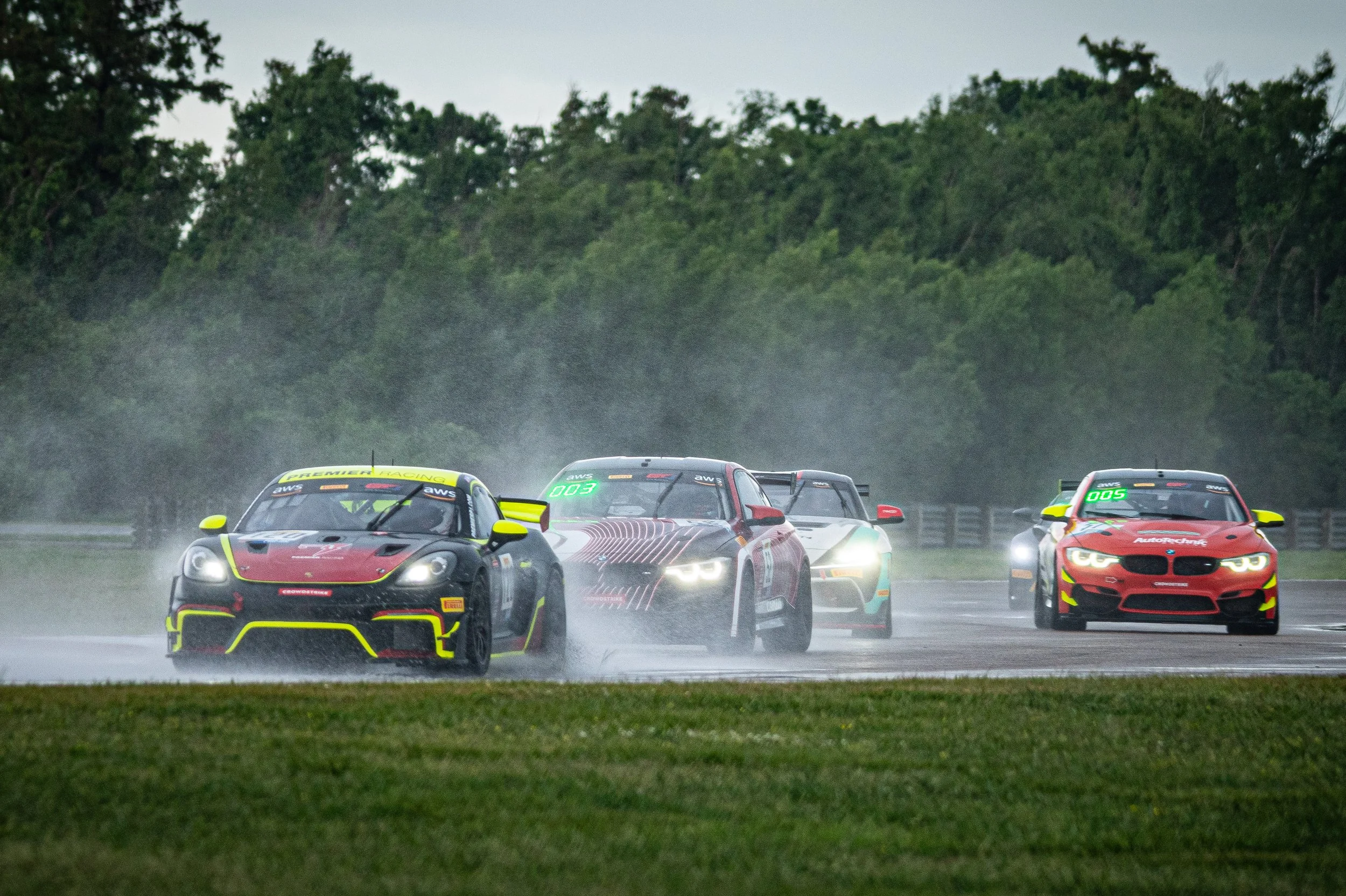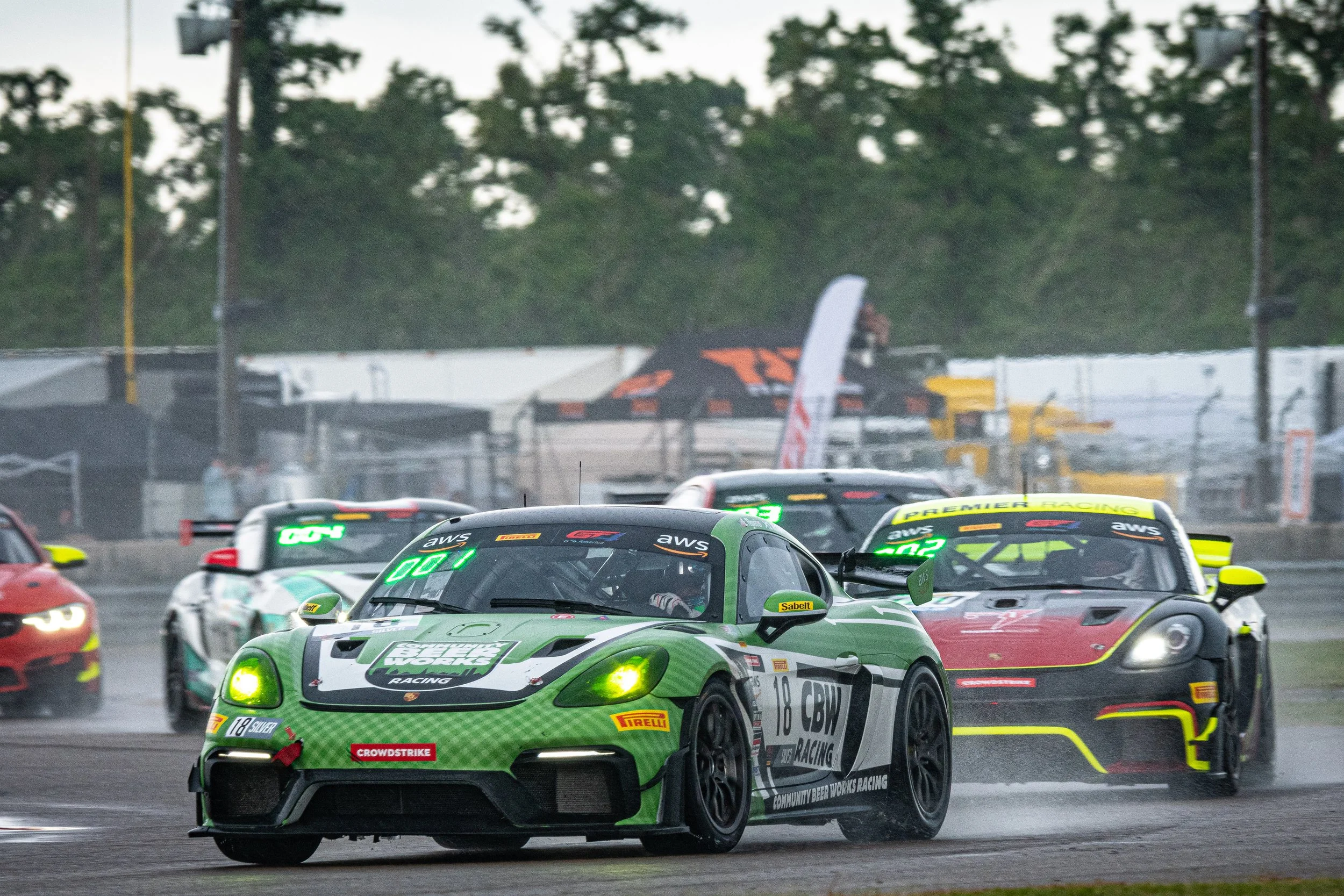 While the leaders accelerated towards turn one, rows five and six made contact near the start line resulting in three cars being eliminated and began a lengthy caution period. Three cars were too damaged to continue. With 40 minutes left to race, Race Control red-flagged the race due to severe weather conditions and the risk of lightning. At the time of the stoppage, the #18 RS1 Porsche 718 Cayman GT4 RS Clubsport driven by Eric Filgueras was in the lead followed by Pro-Am driver Adam Adelson in the #120 Premier Racing Porsche 718 Cayman GT4 Clubsport and the #52 Auto Technic Racing BMW M4 GT4 driven by Tom Capizzi.