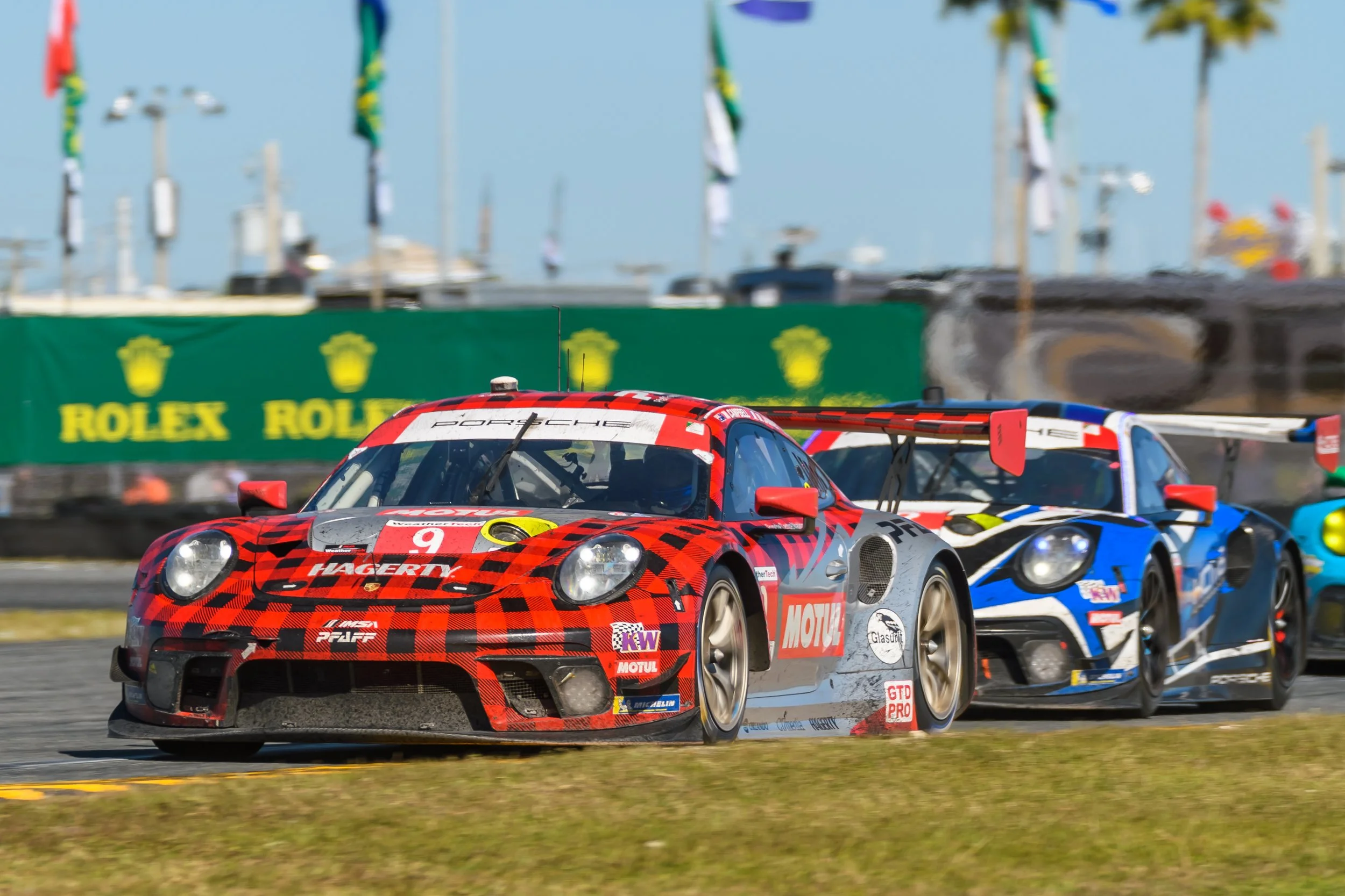 But Vanthoor wasn’t done. The blue-and-white KCMG Porsche bumped the plaid Pfaff car through Turn 5 before unsuccessfully trying an over-under move through Turn 6 as the cars headed onto the Daytona oval one last time.